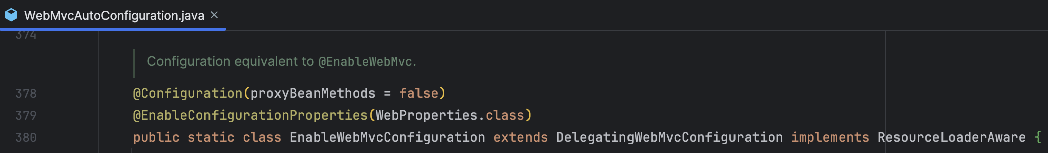 하지만 WebMvcAutoConfiguration에서는 DelegatingWebMvcConfiguration를 상속하는 EnableWebMvcConfiguration을 임포트 하며 @EnableWebMvc와 동일한 역할을 수행하고 있는 것을 확인할 수 있다.
